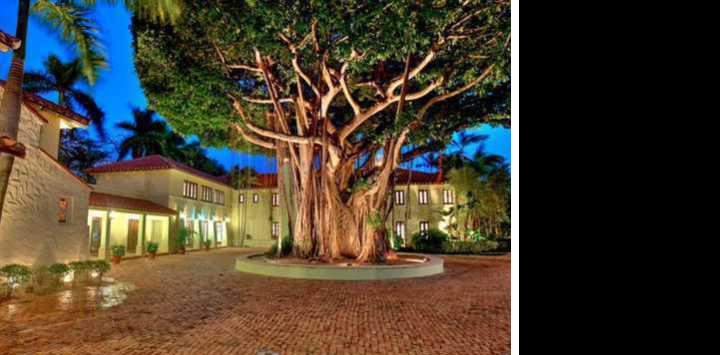 At the front there's a massive red brick motor court shaded by a massive mangrove tree at its center. At least we think it's a mangrove. Anyways, at the back of the house there's extensive tropical landscaping, a swimming pool, and 203 feet of water frontage with private boat dock.
